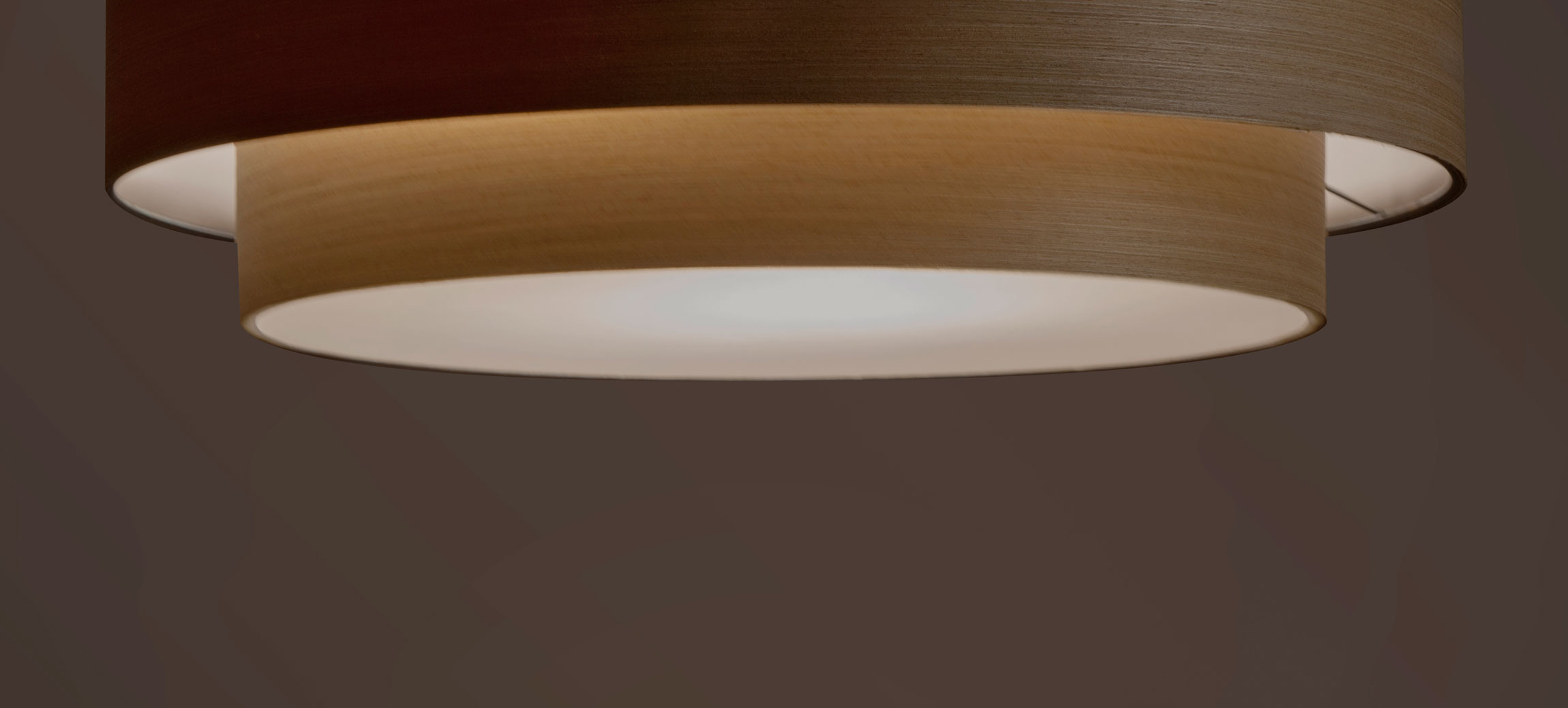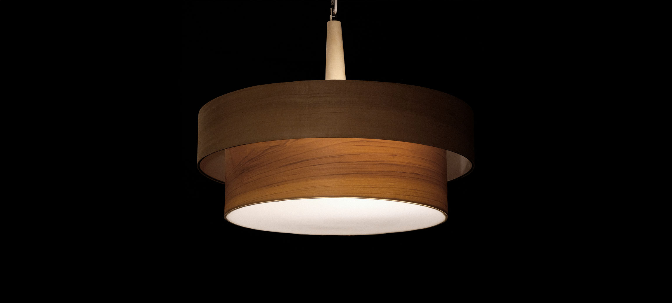 Fabricada en los talleres de INCREA, la lámpara Dos Aros se compone de una estructura metálica revestida en finas láminas de madera, montadas a mano con precisión artesanal.